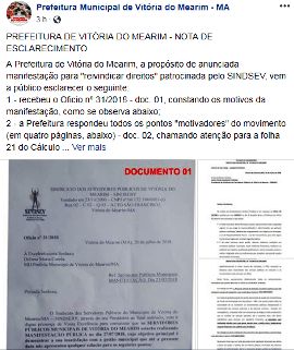 A Prefeitura de Vitória do Mearim, a propósito de anunciada manifestação para “reivindicar direitos” patrocinada pelo SINDSEV, vem a público esclarecer o seguinte: