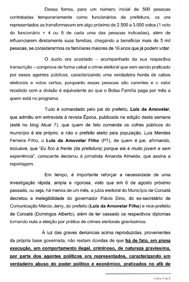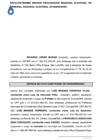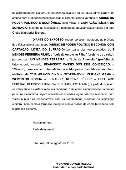 Diante do que foi mostrado na matéria “Crime eleitoral corre livre e solto em Coroatá… Escutem o vídeo!!!”, publicada no dia 29 de agosto de 2018: A utilização de meios ilícitos para alcançar votos para correligionários continua de forma aberta… Que a Justiça, caso queira fazer justiça, precisa tomar as providências cabíveis, e observar essa prática antidemocrática, antiética, imoral e, principalmente, corrupta por todo o Maranhão!!!, Ricardo Murad ingressa com representação na Procuradoria Regional Eleitoral, conforme abaixo: