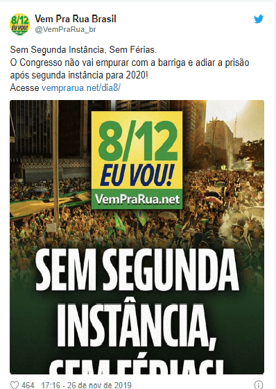 O movimento Vem Pra Rua resolveu convocar para o dia 8 de dezembro nova manifestação para pressionar o Congresso Nacional a retomar a prisão em segunda instância.