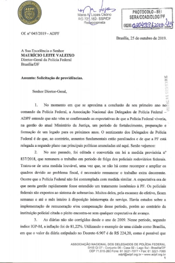 Diante desse ofício 045/2019 da Associação Nacional dos Delegados de Polícia Federal, assinado por Edvanir Felix de Paiva, presidente da ADPF, endereçado ao Maurílio Leite Valeixo, diretor-geral da Polícia Federal, vem mostrar a falta de comprometimento e competência com a Polícia Federal por parte de seu diretor-geral e do ministro da justiça.