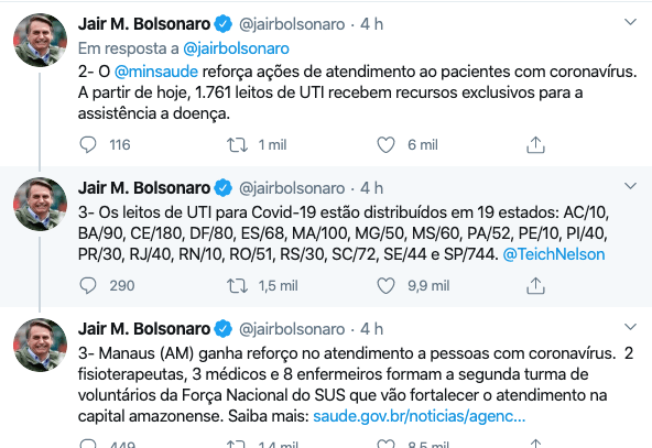 Já a ministra Tereza Cristina (Agricultura, Pecuária e Abastecimento), o abastecimento do Brasil “funciona normalmente”. Por isso, os “brasileiros têm comida na ponta”. Ela acrescentou que, neste mês, haverá “recorde das exportações brasileiras.”