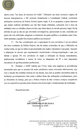 O ofício diz claramente que a Polícia Federal está inerte e que diversos assuntos de grande importância estão paralisados.
