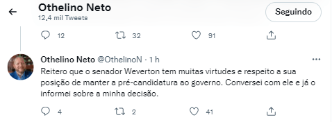Que siga o seu caminho como fez o deputado Othelino Neto, que disse: “Reitero que o senador Weverton tem muitas virtudes e respeito a sua posição de manter a pré-candidatura ao governo”…