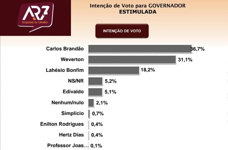 A pesquisa AR7 aponta a consolidação o segundo turno entre Brandão e Weverton Rocha, que obtiveram os seguintes percentuais: Brandão 36.7%,Weverton 31.1%, Lahésio 18.2%, Holanda Junior 5.1% , 1% cada um dos demais candidatos, 5.2% de indecisos e 2.1% de Nenhum/Nulo.