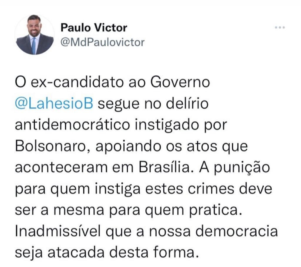 Diante dos fatos, o presidente da Câmara Municipal de São Luís, Paulo Victor (PC do B), também utilizou as redes sociais, nesta segunda-feira, para criticar o ex-prefeito de São Pedro dos Crentes e candidato derrotado ao Governo do Maranhão, Lahesio Bonfim (PSC).