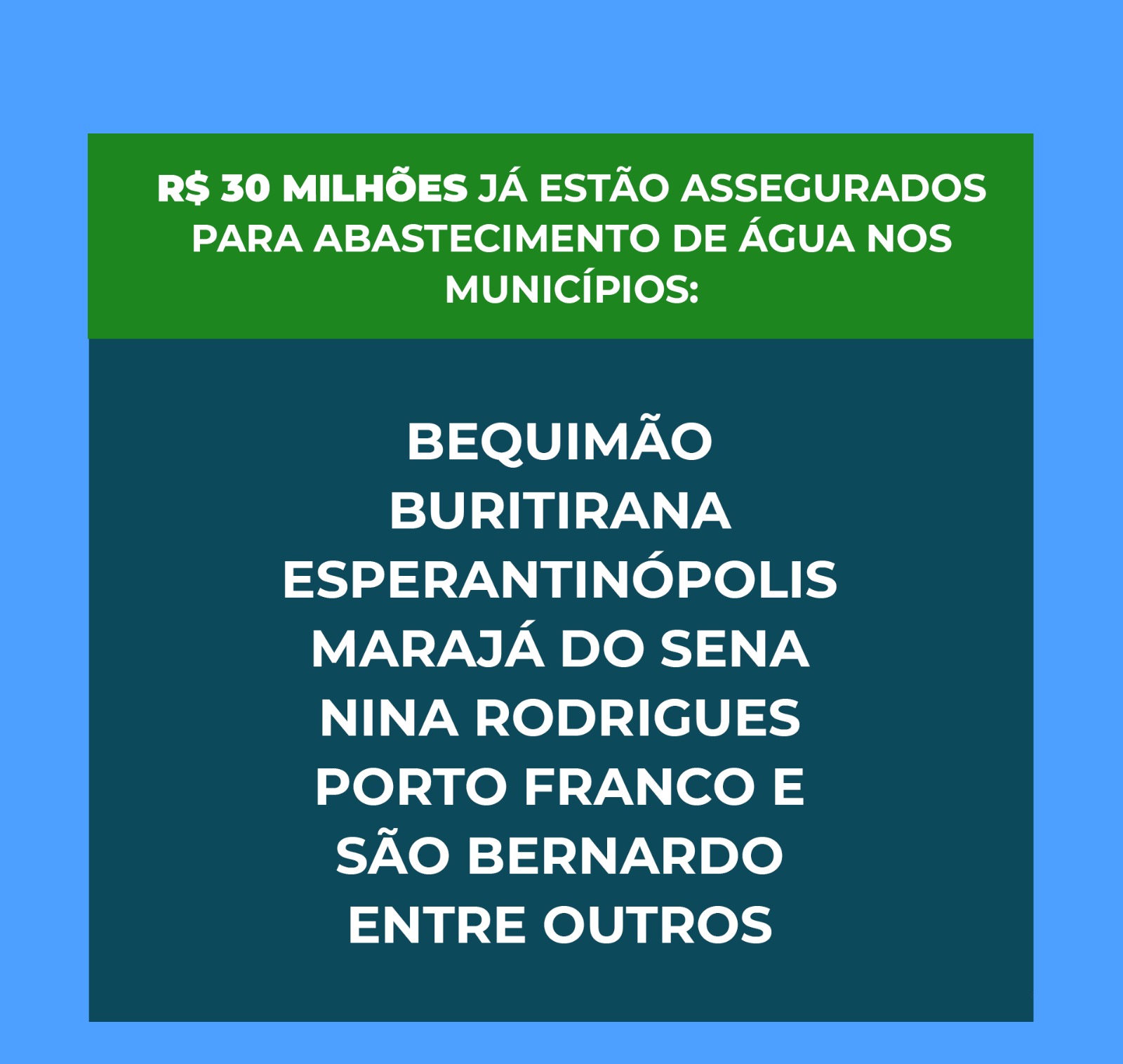 O parlamentar explicou que já tinha conseguido assegurar, por meio de emendas parlamentares de sua autoria, R$ 30 milhões de reais para serem aplicados em obras de abastecimento de água nos municípios de: Bequimão, Buritirana, Esperantinópolis, Marajá do Sena, Nina Rodrigues, Porto Franco e São Bernardo, entre outros.